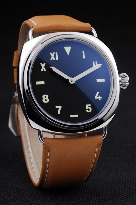 La resistente caja de 44 x 45 mm alberga un impresionante cristal de zafiro y una esfera marrones con marcadores de hora luminiscentes. La corona calada de la corona de acero inoxidable pulido está adornada con el logotipo de Panerai, agregando un toque de lujo a este elegante reloj. La correa de cuero marrón claro con costuras blancas presenta el relieve de Officine Panerai Italia y se abrocha con una hebilla de acero inoxidable con el grabado de Panerai.