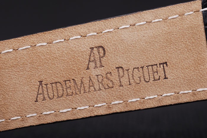Bracelet: correa de piel de cocodrilo Negro con costuras en blanco y calor en relieve Audemars Piguet nombre y el logotipo y un Audemars Piguet inscriben acero inoxidable flip-sobre el gancho clasp