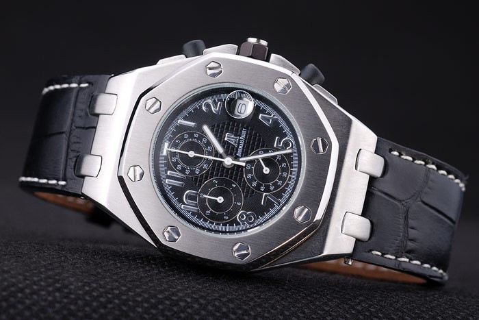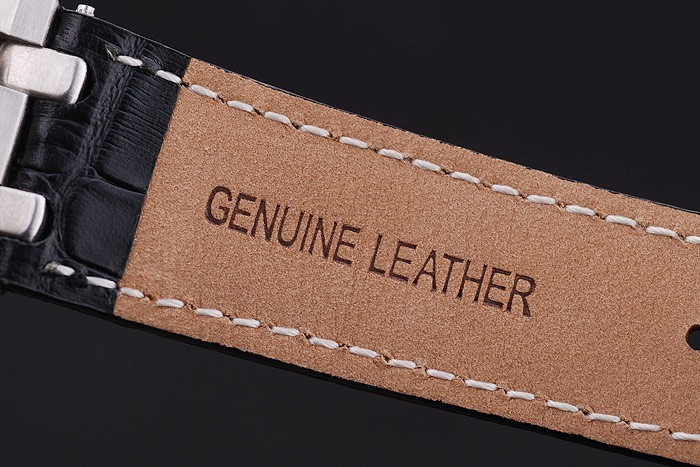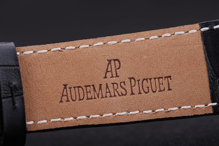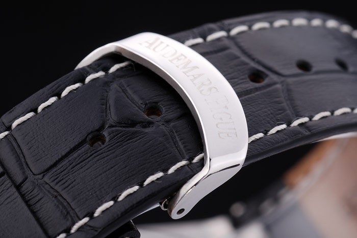 Bracelet: correa de piel de cocodrilo Negro con costuras blancas de hilo y en relieve de calor nombre de Audemars Piguet y el logotipo y una Audemars Piguet inscrito acero inoxidable flip-sobre el gancho clasp