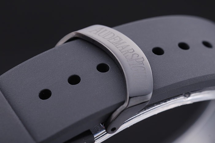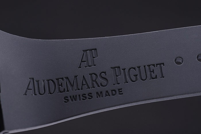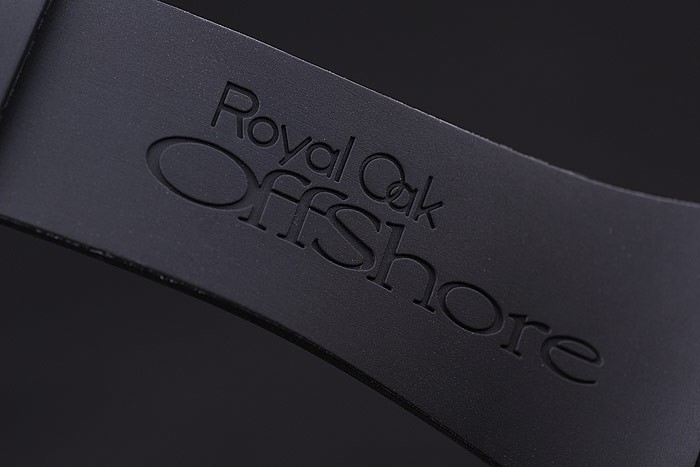 Bracelet de acero inoxidable: correa de caucho Negro con relieve de calor sello Audemars Piguet Royal Oak Offshore y una Audemars Piguet inscrito ion-plateado gancho hebilla clasp
