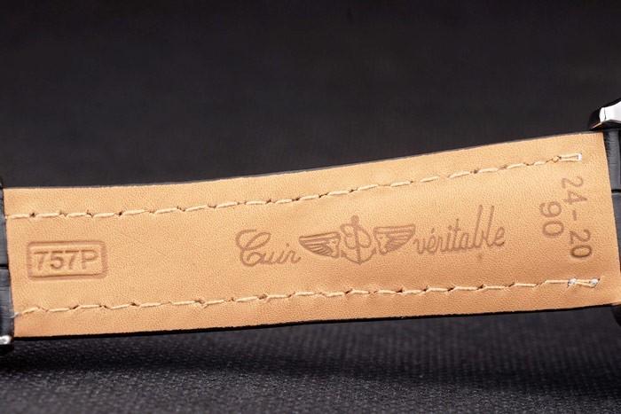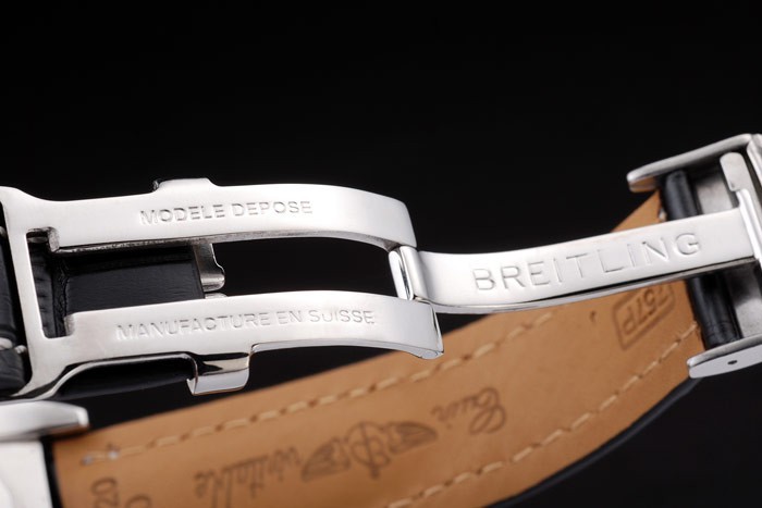 Bracelet de acero inoxidable: correa de piel de cocodrilo Negro con la patente costuras de color blanco y el calor en relieve grabados Breitling y acero inoxidable grabado doblar por la broche con el logotipo de Breitling en top