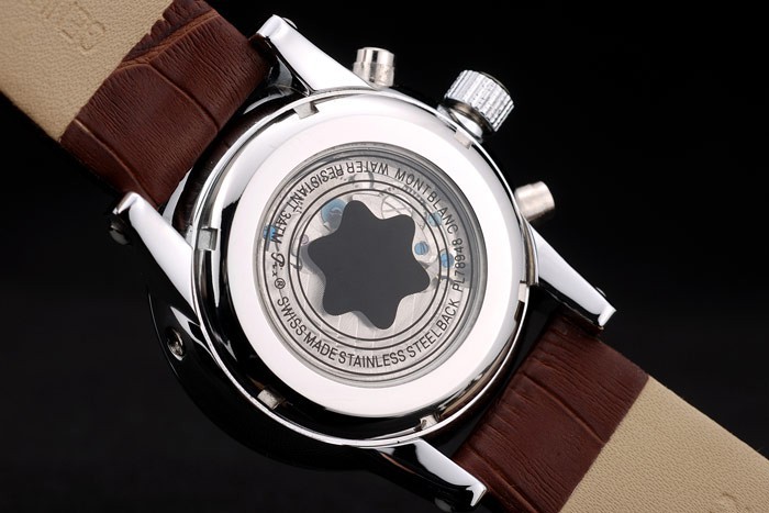 Crown: acero inoxidable pulido corona de calado con el logotipo de Montblanc y dos coronas de pulsadores de acero inoxidable pulido a ambos lados de it