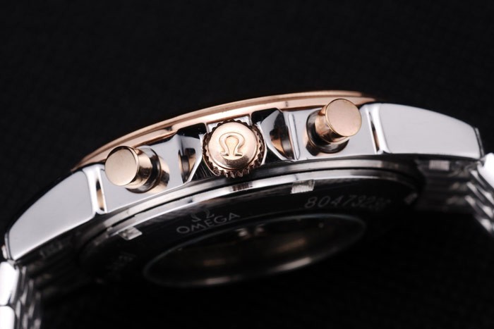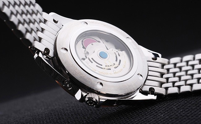 Volver: Acero inoxidable de empuje en el caso de vuelta con inscripciones Omega y transparencia en el centro revela que la mecánica within