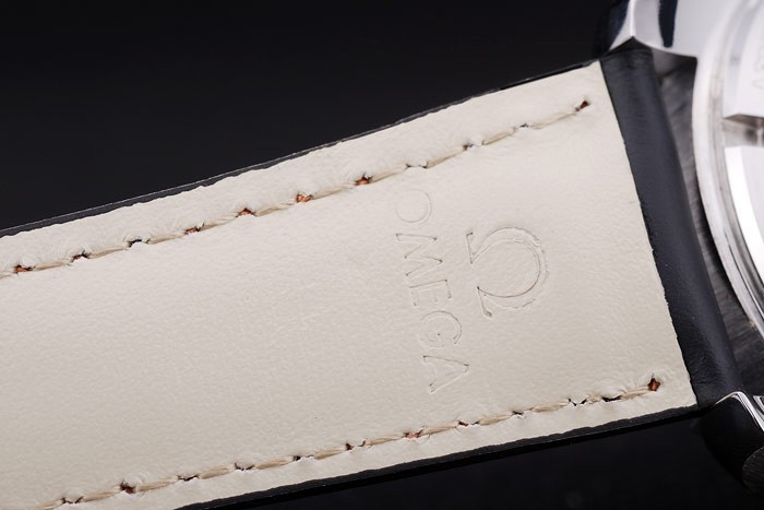 El calor de acero inoxidable pulido en relieve nombre de Omega y correa de cuero negro de color naranja con el logotipo logotipo de costura Omega grabado: Volver: Acero inoxidable complemento de vuelta con 007 Edición limitada engravings