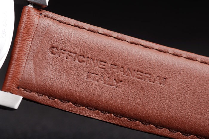 Bracelet: Correa de piel marrón con costuras de color blanco y en relieve de calor sello de Officine Panerai Italia y acero inoxidable cepillado de gancho hebilla de cierre con Panerai engraving
