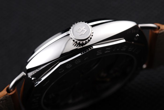 Bracelet de acero inoxidable: correa de cuero marrón claro con costuras de color blanco y en relieve de calor sello de Officine Panerai Italia y pulida de acero inoxidable gancho hebilla de cierre con Panerai engraving
