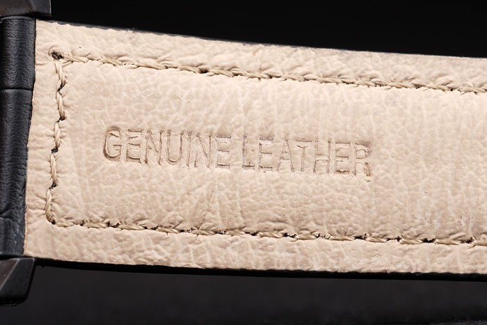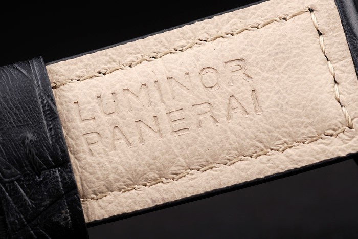 Bracelet: correa de piel de cocodrilo negro con costuras en blanco y calor en relieve sello Luminor Panerai y acero inoxidable gancho hebilla de cierre de ion-plateado con Panerai engraving
