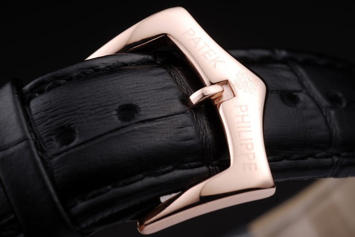 Bracelet de acero inoxidable: correa de piel de cocodrilo Negro con relieve de calor Sello Patek Philippe y 18k de oro rosa gancho plateado corchete -buckle con Patek Philippe engraving
