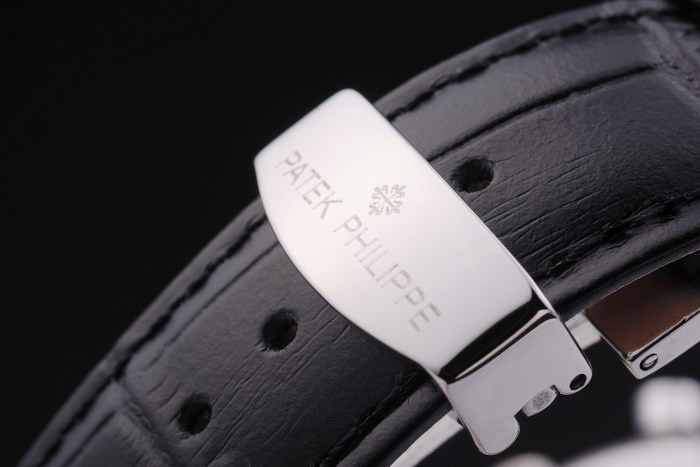 Bracelet de acero inoxidable: correa de cuero Negro con el sello de Patek Philippe y un pliegue de acero inoxidable en clasp