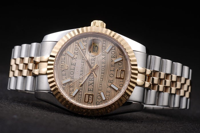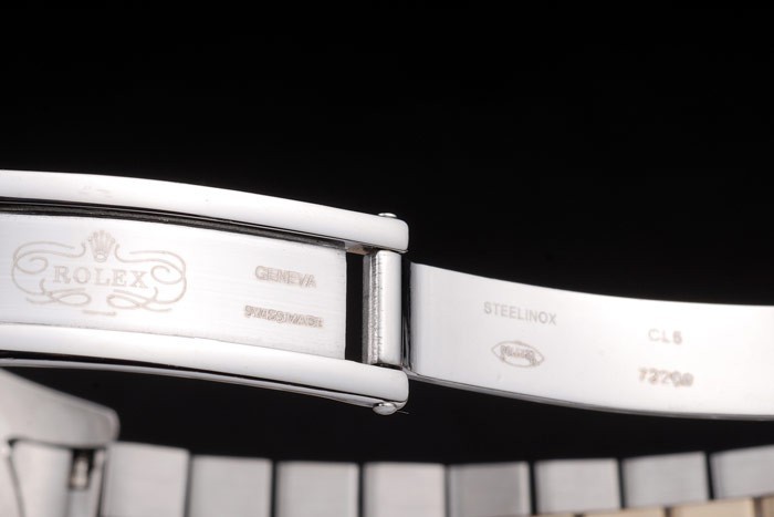 Bracelet de acero inoxidable: Acero Dos brazalete de eslabones de tonos de acero inoxidable cepillado y oro amarillo de 18K plateado con Rolex grabado cierre oculto mostrando la longitud Rolex logo