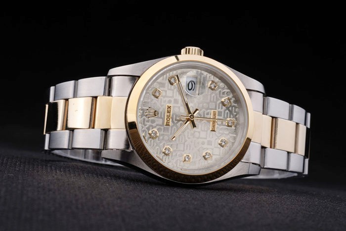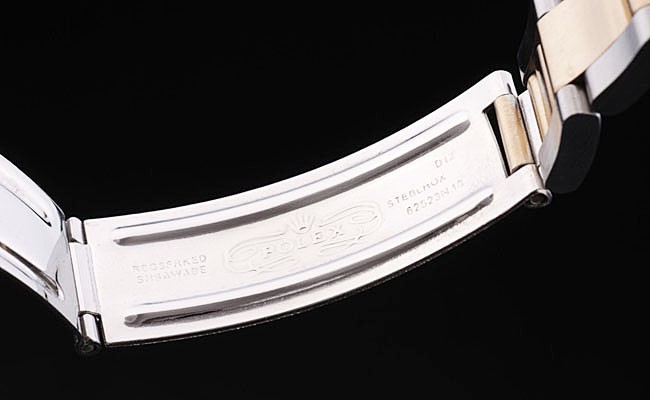 Bracelet de acero inoxidable: Dos brazalete de eslabones de tonos de acero inoxidable cepillado y oro amarillo de 18K chapado en acero plegada con el grabado Rolex en el cierre desplegable que muestra la longitud Rolex logo