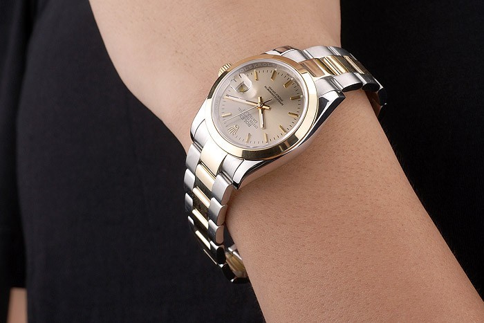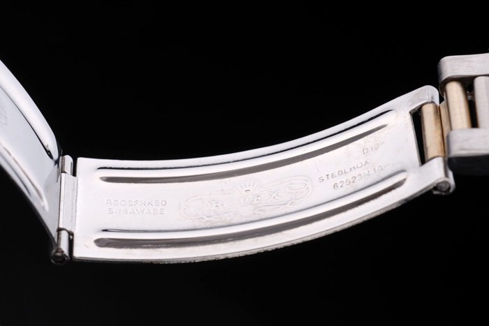 Bracelet de acero inoxidable: Dos brazalete de eslabones de tonos de acero inoxidable cepillado y oro amarillo de 18K chapado en acero plegada con el grabado Rolex en el cierre desplegable que muestra la longitud Rolex logo