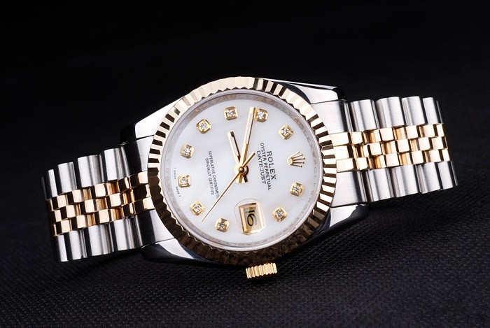 Bracelet de acero inoxidable: Dos brazalete de eslabones de tonos de acero inoxidable cepillado y oro amarillo de 18K chapado en acero con cierre oculto grabado Rolex mostrando la longitud Rolex logo