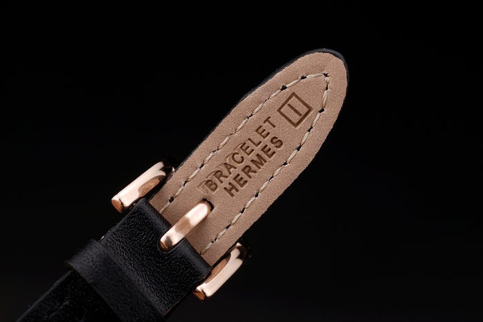 Bracelet: alargado correa de cuero negro con el sello en relieve calor y la pulsera de Hermes Hermes grabado oro rosa plateado gancho hebilla de cierre
