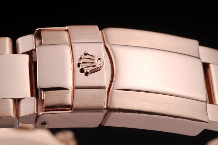 Bracelet: rosa de 18 quilates de acero inoxidable pulsera de eslabones de oro chapado con Rolex grabado plegado en el cierre desplegable que muestra la longitud Rolex logo