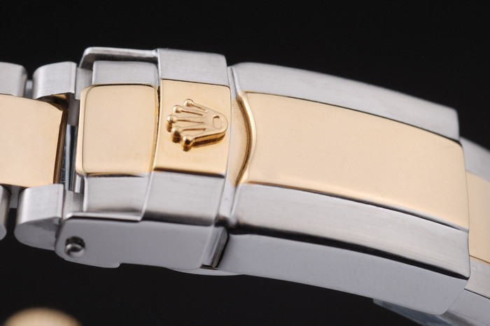 Bracelet acero: Dos tonos brazalete de eslabones de cepillado y acero inoxidable tono de oro con el grabado Rolex cierre desplegable que muestra la longitud Rolex logo