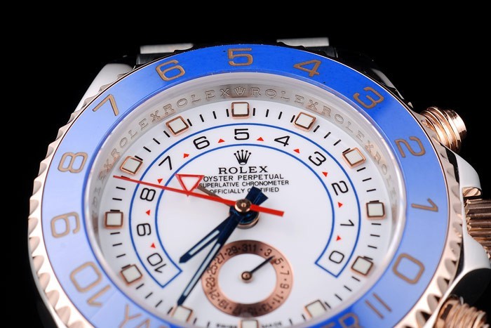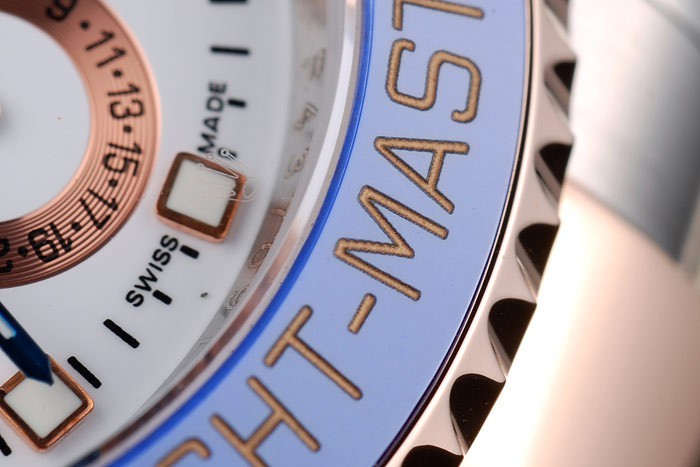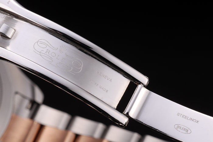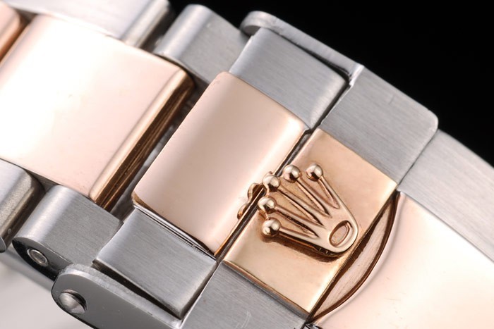 Crown: 18k de oro rosa corona calado con el logotipo de Rolex y dos botones coronas cutwork empuje más pequeños a cada lado de it