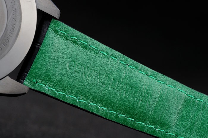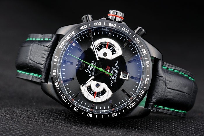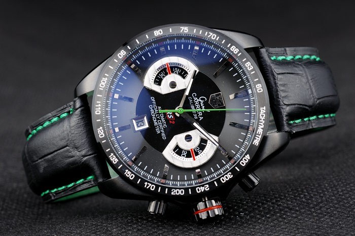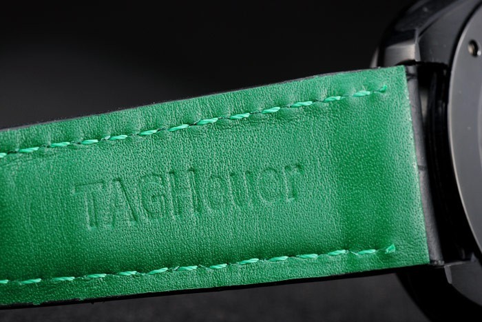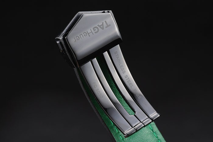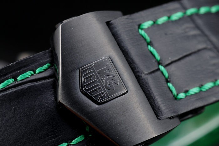 Bracelet de acero inoxidable: El calor en relieve de etiquetas correa de piel de cocodrilo negro Heuer con hilo de costura verde y el ion-plateado empuje de liberación veces por encima de broche con la etiqueta Heuer logotipo en top