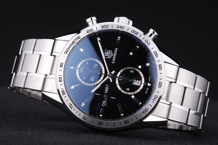 Volver: Acero inoxidable pulido snap-in de nuevo con la mecánica que revelan transparencia en el centro y Tag Heuer Carrera engravings